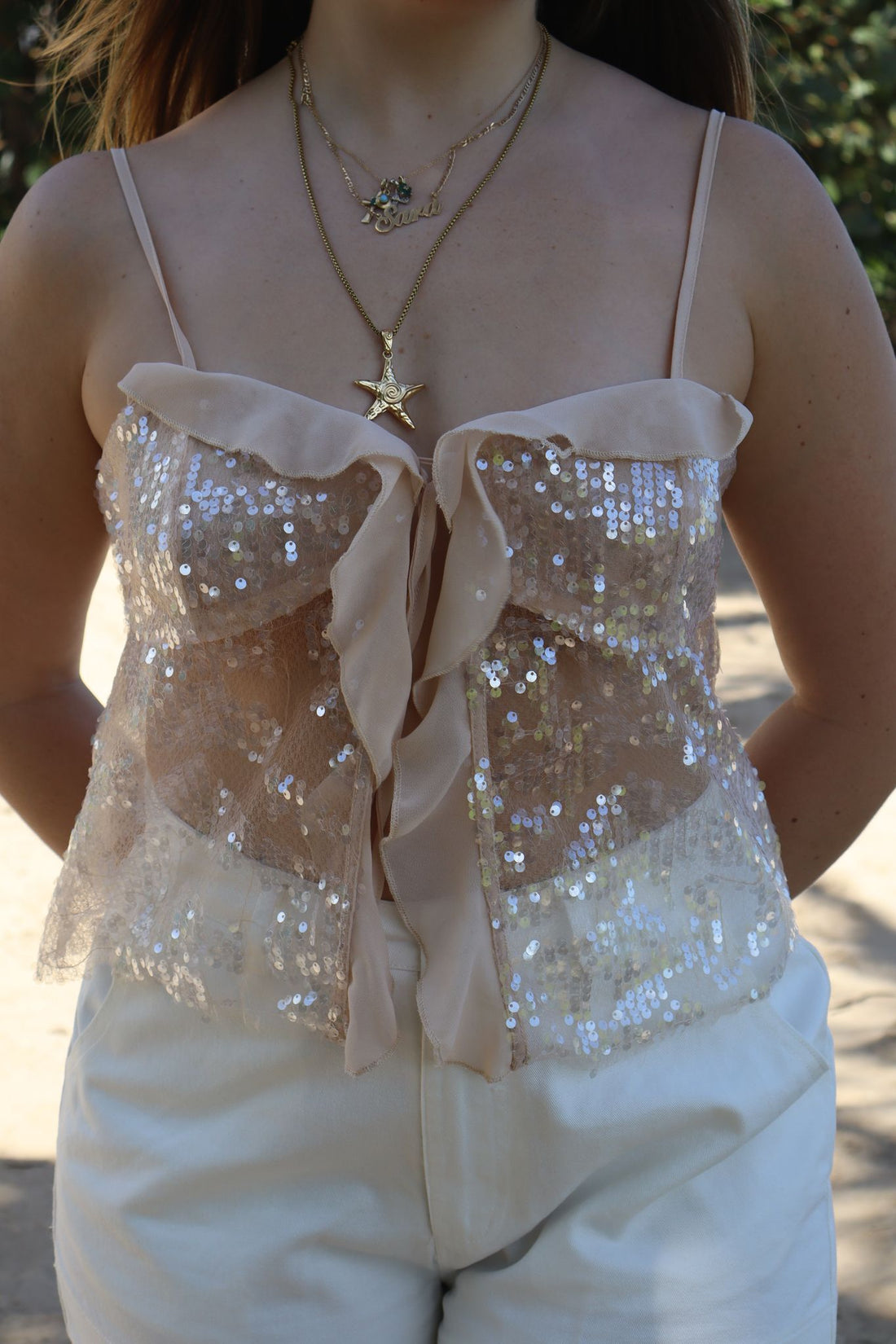 Beautiful sequin sleeveless cropped top. Model is wearing size Small.