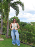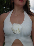 Soft, elegant, and uniquely stylish! This ribbed knit halter top features a beautiful 3D floral detail at the center, adding a feminine and chic touch. Perfect for styling with jeans, skirts, or tailored pants!